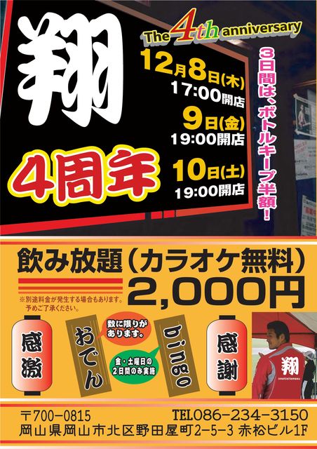 当店もおかげさまをもちまして、まもなく4周年を迎える運びとなりました。 これもひとえに、みなさまの日頃からのご支援の賜物と、深く感謝いたしております。 つきましては、みなさまへの感謝の気持ちを込めまして、下記のとおり『4周年パーティ』を開催させていただきます。 みなさまのご来店を、心よりお待ち申し上げております。 ☆☆☆☆☆☆☆☆☆☆☆☆ 『翔』4周年パーティ ☆☆☆☆☆☆☆☆☆☆☆☆ 日時:平成23年12月8日(木)〜10日(土) 8日は17時より、9日・10日は19時