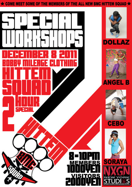 12月8日(木) 8PM-10PM THE BMC (BOBBY MILEAGE CLOTHING) HITTEM SQUAD 2時間 SPECIAL WORKSHOP なんと!!会員1,000円/非会員2,000円 ELITE FORCEのBOBBYの新しいクルー メンバー紹介ワークショップ ! FRESHなダンサー4名が岡山に集結し ホットなダンスを教えてくれるよ!! ワークショップ講師 ANGEL ブラジル出身のエンジェル。ブラジルで有名なアーティスト達の 振付師として活躍。EVEのブラジルコンサート振付とダンサー担当、 ビヨンセのブラジルコンサートのオープ