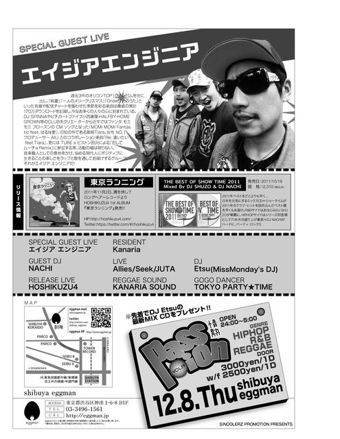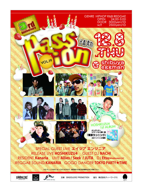 コミュニティ管理人様、参加者様 イベント告知失礼致します。 ********************************* 2011/12/8(Thu) 情熱-passion- Vol.19 ≪3rd Anniversary≫ 〜HOSHIKUZU4 1stALBUM『東京ランニング』RELEASE PARTY〜 場所:渋谷eggman OPEN:24:00-5:00 GENRE:HIPHOP R&B REGGAE DOOR:3000YEN/1D W/F:2500YEN/1D [SPECIAL GUEST LIVE] エイジア エンジニア http://asiaengineer.syncl.jp/ [RELEASE LIVE] HOSHIKUZU4 http://hoshikuzu4.com/ [GUEST DJ] NACHI [RESIDENT]