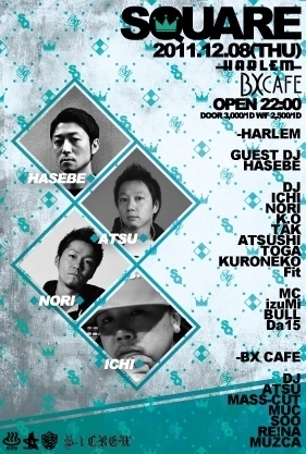 管理人様、告知失礼します。 今夜12/8(木)に渋谷HARLEM + BX CAFEにてDJタイムオンリーのイベント「SQUARE」が開催されます 入り口で「DJアツシのゲストでハーレム」と伝えていただければ何名でも、 また書き込みやメッセージ等で連絡もらえれば、¥1500/1D のゲストにて招待させていただきますので気軽に連絡してください イベント詳細です 「SQUARE」 10.12.8 (月) OPEN22:00〜 渋谷@HARLEM + BX CAFE ■HARLEM SIDE ◯GUEST DJ - HASEBE ◯DJ - ICHI/NORI/K.O/TAK/ATSUSHI/TOGA/KURONEKO ◯MC - izuMi/BUL
