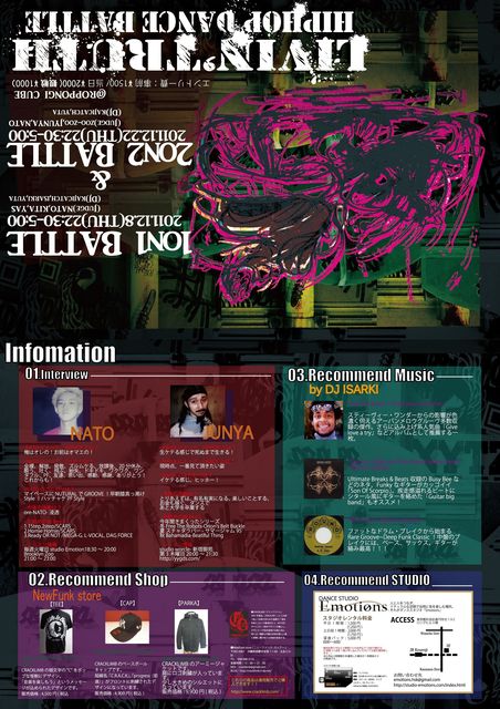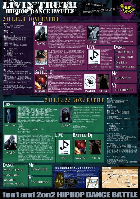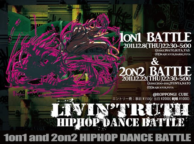 LIVIN'TRUTH 〜1on1 hiphop dance battle〜 日時 2011.12.8 THU(22:30-5:00) ※1次予選、23:30 START 場所 六本木CUBE エントリー費 事前1500 (12/7 23:00まで) 当日2000円(12/8 23:00まで) ※エントリー費用は、当日回収。 judge NATO(DIGGIN'PROPS/BED4ORD/ZULU-MK-MASTERZ) KITA (SIVA) YAS(DIGGIN'PROPS) BATTLE DJ ISARKI KAJICATCH YUTA ☆優勝☆ 賞金3万円 ■エントリー方法 名前 TEAM名 連絡先メールアドレス を明記の上、 メールタイトルに