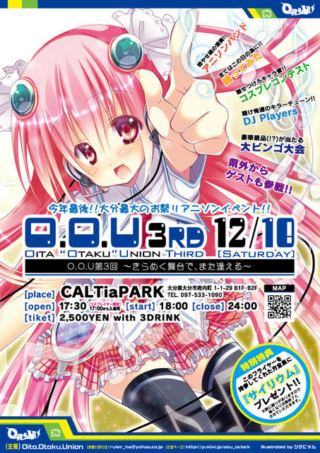 GWから早くも数ヶ月…第一回、第二回と100人以上の増加を見せ、最高の盛り上がりを見せている大分最大級のオタクイベントが早くも始動!! Oita Otaku Union略してO.O.U! O.O.U!3rd 〜きらめく舞台で、また逢える〜を開催致します!! 前回参加は総勢227人でした!! 今回は行くぜ300人!!一気に九州最大規模のイベントへと駆け上がりましょう!! 今回も2011年の締め括りに相応しいステージが待っています!! コスプレ、DJ、踊ってみた、歌ってみた、描いてみた…etcとノンストップ!! 『参加者全員が主役に!そして