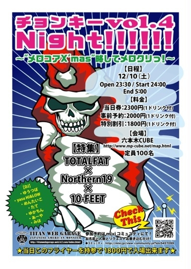 チョンキーNight!!!!!!とは… 音楽やお友達を作る"キッカケ"を提供するイベントを目指しています☆ ライブに行きたいけどいつも一人で仲間がほしい方! 好みが合う音もだちがもっとほしい方! この3つのアーティストでびびっときた方! このイベントに来れば友達ができるはず\(^o^)/ 集まった人達が共に2Stepでもスカダンでもサークルでもモッシュでも左回りでも! 一緒に歌ったり踊ったり楽しんじゃう感じの初心者向けイベントです♪(´ε` ) 初めての方でも一人参加でも音楽が鳴り始まればみんな友達\(^o^)/ 僕ら