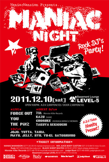 ManiacMansion Presents... MANIAC NIGHT 2011.12.10(sat) @桐生 Basement Lounge LEVEL-5 http://www.lv5.m e