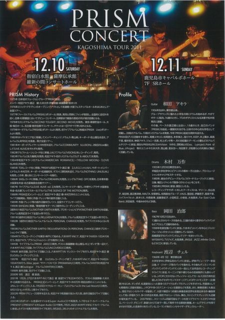 管理人様。 貴重なスペースをお借りして告知させて頂きます。 去年に続きPRISMが今年もやってきます! 今回はキーボードに渡辺チェルを迎え新作を引っさげてのLiveです。 若い方には聞きなれないバンドかも知れませんが 僕らの世代、ロックからフュージョンへの過渡期に 日本で最初にデビューしたフュージョンバンドです。 カシオペアやスクエアの先輩格のバンドで、現在でも 日本を代表するバンドの一つと言っても決して過言ではありません。 僕も学生時代に中野サンプラザに聞きに行きました。 メンバーそれぞれ