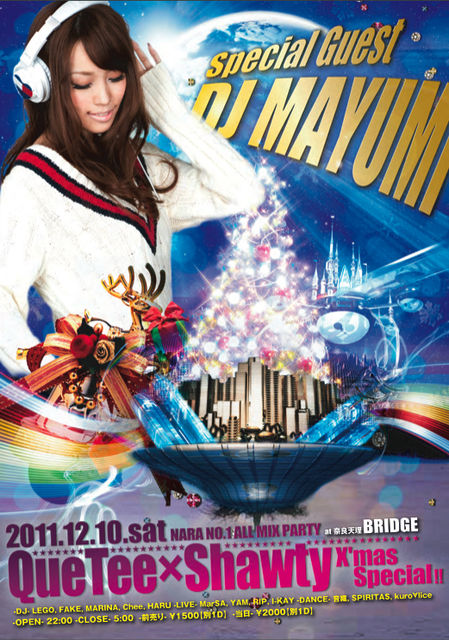 NARA NO.1 ALL MIX PARTYQUE TEE×ShawtyX'mas Special 12月10日【土】 【OPEN】22:00 【CLOSE】5:00 前売り1500【別1D】 当日2000【別1D】 奈良天理@CLUB BRIDGE Shawty Present【ジェルネイル&ハンドマッサージ】 QUE TEE Present 1月QUE TEE500円OFF チケットPresent QUE TEEサンタによる、テキーラ、シャンパン、酎ハイ振る舞い有り先着でX'mas CD PresentSpecial Guest DJ MAYUMI 【DJ】 LEGO FAKE MARINA Chee HARU 【