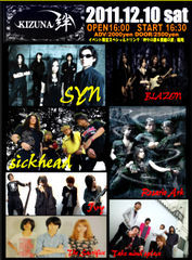 12/10(Sat)近江八幡 Cocoza Hall “絆”KIZUNA OPEN 16:00/START 16:30 ADV.\2000/DOOR.\2500 http://homepage2.nifty.com/cocoza/ 出演バンド SYN sickhead Rosario Ark Ivy The Sacrifice Take mind's place and... BLAZON