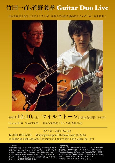 関西が世界に誇るジャズギター界の重鎮、竹田一彦さんと東京で活躍中の菅野義孝さん、日本を代表するジャズギタリストお二人をお迎えしての滋賀県でしか聴けないDUOライブです。 昨年の12月以来、なんと1年ぶりの共演になりました。 このマイルストーンでのDUOライブはまるで自宅のリビングルームで生演奏を聴いてるような、 とっても暖かくて、リラックスした雰囲気で開催されるとーっても楽しいジャズライブです。 この機会に是非、お越し下さい ご予約は僕にメッセージ頂ければOKです 2011年12月10日 · 18:00開