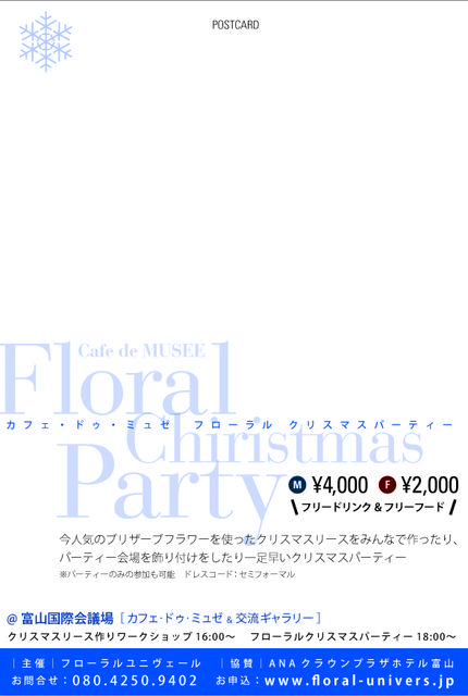 今人気のブリザーブフラワーを使ったクリスマスリースををみんなで作ったり、 パーティー会場を飾り付けをしたり一足早いクリスマスパーティー ※パーティーのみの参加も可能 会場 富山国際会議場(交流ギャラリー&ミュゼ) 料金 男性 4,000円 女性 2000円 フリードリンク&フリーフード 対象 20歳〜39歳までの独身男女60名 問い合わせ フローラルユニヴェール 080-4250-9402 12月10日(土) クリスマスリース作り16:00〜 パーティー18時〜 写真は前回の様子です。