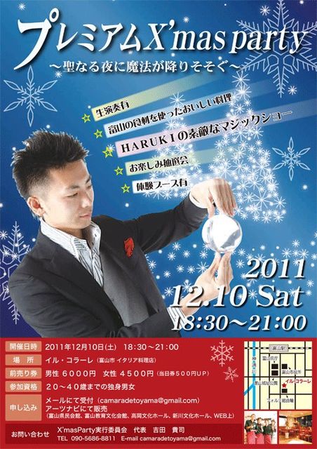 今年もクリスマスの季節に突入 今回で5回目となる、クリスマスパーティーは、スペシャルなコラボレーション尽くし。 ☆日時: 12月10日(土) 18:30〜 受付開始 19:00〜 パーティー開始 21:00 終了予定 ☆場所: トラットリア・バール イル・コラーレ (富山市総曲輪3-2-25総曲輪214ビル 2F) http://r.tabelog.com/toyama/A1601/A160101/16005500/ ☆会費: 前