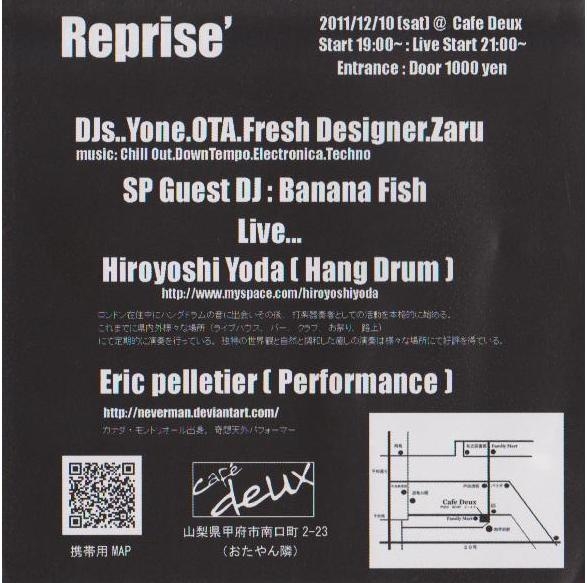 2011年最後のReprise' です! 今回は、Cafe Deux にて行います。 2011年忘年会イベント、。 ライブあり、パフォーマンスあり、と盛りだくさん! 10日は、Cafe Deux にお越し下さい! Reprise' 2011/12/10 @ Cafe Deux http://r.tabelog.com/yamanashi/A1901/A190101/19005276/ Entrance 1000 yen DJs.OTA.YONE.Fresh designer.Zaru SP DJ..Banana Fish Performance:Eric Pelltier Live:Hiroyoshi Yoda