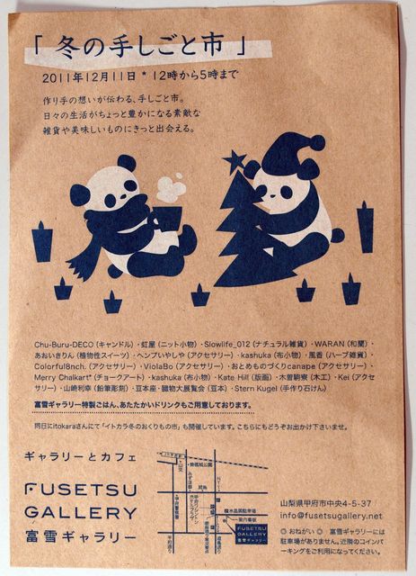 『冬の手しごと市』 日時:2011年12月11日(日) 12時〜17時 作り手の想いが伝わる、手しごと市。 日々の生活がちょっと豊かになる素敵な雑貨や美味しいものにきっと出会える。 出店詳細は添付フライヤーをご覧ください。 富雪ギャラリー・FUSETSU GALLERY http://fusetsugallery.net/ 山梨県甲府市中央4-5-37 TEL:055-287-9937 *富雪ギャラリーには駐車場はありません。 近隣のコインパーキングをご利用ください。