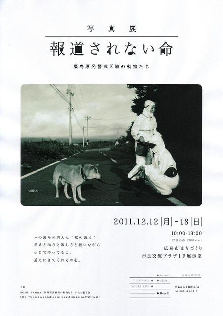 『報道されない命〜福島原発警戒区域の動物たち』と題した写真展が、広島市まちづくり市民交流プラザ(南棟1F展示スペース)で開催されます。期間は12/12(月)〜18(日)の10:00〜18:00です。 福島の原発避難指示区域(立入禁止)の半径20km圏内では、救助を待つペットたちが数多く残されているのですが、一人でも多くの方にその惨状を知って頂くための写真展です。 小規模なので入場は無料となっており、袋町小学校に隣接した場所だから分かりやすいと思います(アンデルセン近く)。 最寄りの際には是非、足を運んで見て下さい。 宜しくお願い
