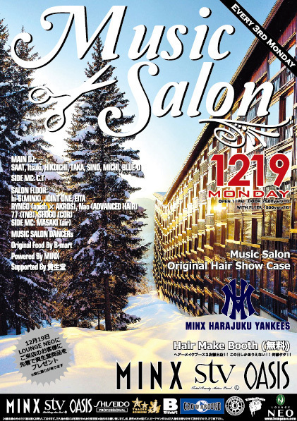 管理人様告知失礼します。 毎回美容師やアパレル関係やお洒落さんで400人規模で賑わう、 毎月第3月曜日渋谷LOUNGE NEOで開催される『MUSIC SALON』!! 入場者全員様に資生堂より豪華商品をプレゼント!! 今回は有名SALON【MINX】によるヘアショー、【MINX】【OASIS】【stv】による無料ヘアブースと豪華な内容です!! −−−−−−−−−−−−−−−−−−−−−−−−−−−−−−−−−−−−−− ☆ゲスト料金☆ 1500/1D or 1000/ND ※メッセージ頂ければ上記のゲスト料金にて入場できます!! 『代表者名+人数』を添え