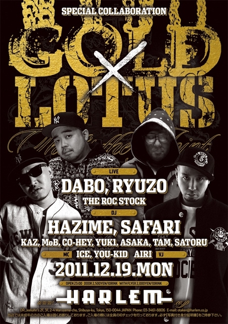 12/19(mon)『GOLD×LOTUS』 @HARLEM ★★★★★ メッセージ頂ければ、ゲスト料金(1500円/1D)にてご招待させて頂きます! 代表者名とだいたいの人数をメッセージ送って下さい! 折り返しメッセージ致します!! ★★★★★ ☆☆☆☆☆ メッセージ頂かなくても、エントランスにて「ユキのゲストでロータス」とお伝え頂ければ、同じくゲスト料金(1500円/1D)で何名様でもご入場頂けます! お気軽にご利用ください!! ☆☆☆☆☆ 12/19.Mon〈GOLD×LOTUS〉第2回開催決定!! DABO&RYUZOの最強タッグがお届けするGOLDと、平日最強