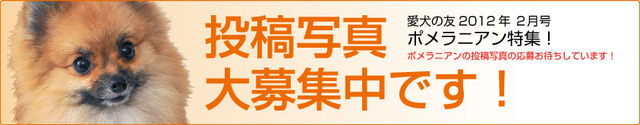 ポメラニアン限定! 愛犬の友、掲載投稿写真大募集! 愛犬の友2012年2月号(2012年1月25日)で「ポメコレ!! 〜pomephoto collection〜」(仮タイトル)という、愛犬の投稿写真を集めた特集が決定しました! みなさんの愛しいわが子のベストショット(笑える写真・迫力ある写真・美しい写真・かわいい写真・泣ける写真etc)なんでもOK! もちろん、普段遊んでいる姿や寝ている姿、旅行しているシーンなどでもOK! 応募いただいた写真はすべて掲載予定です。 どしどしご応募ください! 参加・応募はこちらのホームページからメー