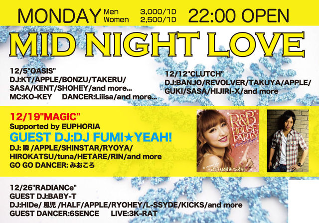 12月19日、月曜日!! 渋谷 CLUB ATOMの大人気イベント【MAGIC】が、ELFにてパワーアップして開催です! Guest にはDJ FUMI★YEAH!が登場!! 人気美容室EUPHORIAと完全タイアップによるヘアブースもあり♪ ディスカウントのお知らせです♪ 通常3000円かかってしまうところ、 エントランスで、 『シュンのゲストのナガノ』 と言えば特別ディスカウント!!! ディスカウントの料金設定は、 女性 1000/1d 男性 1500/1d となっています! また、個別の確実なゲストもご用意できますのでご希望の方は、
