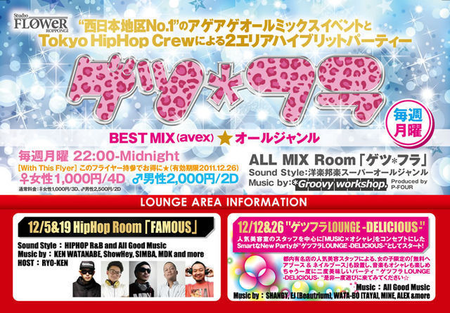 管理人様、告知失礼致します。 平日にも関わらず毎回、300人規模で盛り上がっているBIG PARTY♪ 「月曜フラワー」の略して、 『ゲツ☆フラ』新イベントは超おトク♪!!!! 毎回こんな感じで盛り上がってます♪ (http://www.youtube.com/watch?v=RAp3neQNiug&feature=player_embedded) そして、10/31の月曜日に行われたゲツ☆フラ・ハロウィンスペシャルでは、1000人規模でのこの盛り上がりがコチラ!! (http://www.youtube.com/watch?v=SW5OFQz5iOc&feature=player_embedded) これが『ゲツ☆フラ』の盛り上がりです!!!