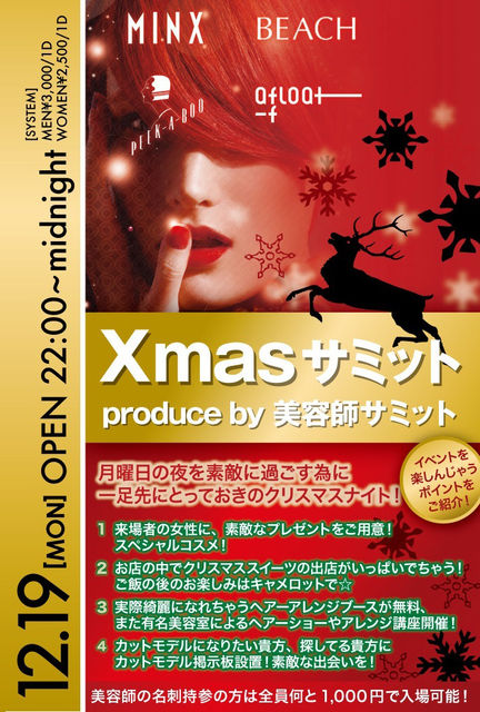 12/19 (月) 渋谷キャメロットにて毎回500人 お洒落ボーイ、お洒落ガール率NO.1イベントです 一足先にとっておきのクリスマスナイト 1 来場者の女性にすてきなプレゼントをご用意!スペシャルコスメ 2 お店の中でクリスマススイーツの出店がいっぱいでちゃう 3 ヘアーアレンジブースが無料!有名美容室によるヘアーショーやアレンジ講座開催 4 カットモデルになりたい貴方、探している貴方にカットモデル掲示板設置 今回は4店舗ヘアーショー MI