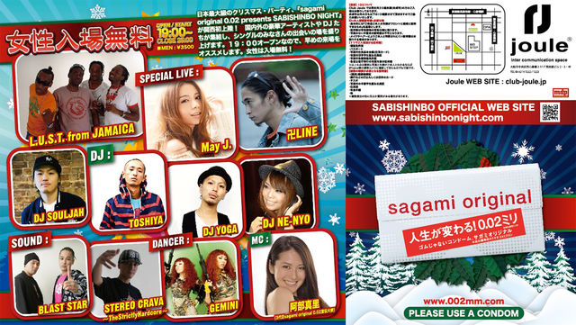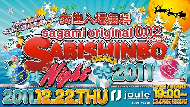 日本最大級のクリスマスパーティ、『sagami orignal 0.02 presents SABISHINBO NIGHT』が関西初上陸 国内外の豪華アーティストやDJが集結し、シングルのみなさんの出会いの場を盛り上げます19:00オープンなので、早めの来場をオススメします 女性は入場無料