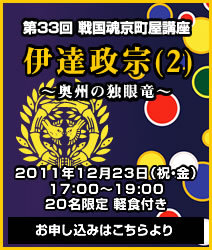 第33回京町家講座『伊達政宗(2)〜奥州の独眼竜〜』の 日程が決定致しましたのでお伝え致します。 <記> ■日時:2011年12月23日(金・祝) 17:00〜19:00 ■題目:「伊達政宗(2) 〜奥州の独眼竜〜」 ■場所:戦国魂京町家本陣(京都市中京区丸太町釜座通下る枡屋町164-1) ■アクセス:京都市営地下鉄・丸太町駅下車西へ徒歩約5分 (丸太町通り府庁前交差点南約100m) ■募集人数:20名 【先着順】 ■参加料:2,500円・・・軽食付き※ http://www.sengokudama.jp/fs/sengokudama/kouza33 講座では昨年の11月に前編