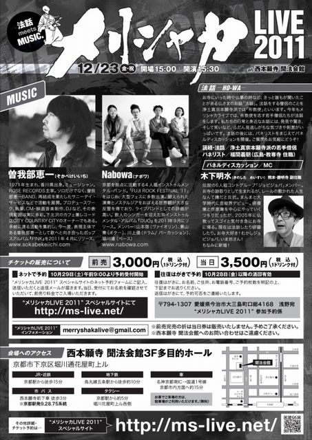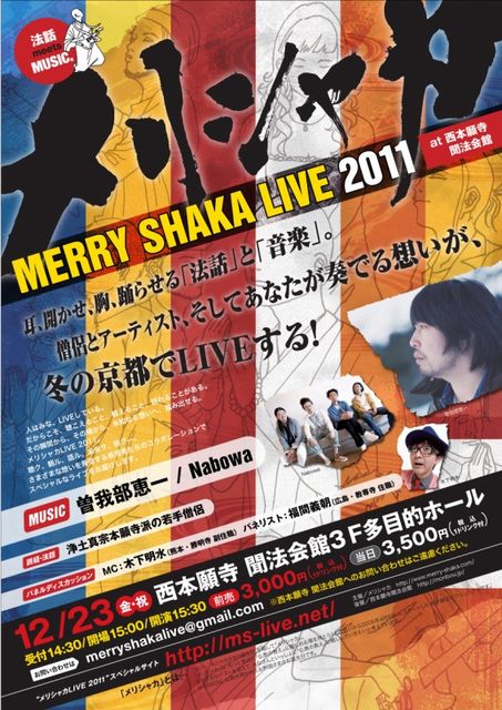 管理人様、貴重なスペース失礼いたします。 「法話meetsMUSIC」をテーマに今年も『メリシャカLIVE2011』を西本願寺聞法会館で行います。どうぞお越し下さい。 出演アーティストは、曽我部恵一/Nabowa MCに元ジョビジョバの木下明水氏を迎えての開催です! 「メリシャカLIVE 2011」 ■開催日時:2011年12月23日(金・祝)PM15:30(受付14:30、開場15:00) ■開催場所:「西本願寺 聞法会館」 ■料金:前売り3,000円(税込) 当日券3,500円(税込) ■出演者: <MUSIC>曽我部恵一、Nabowa <読経・法話>浄土真宗