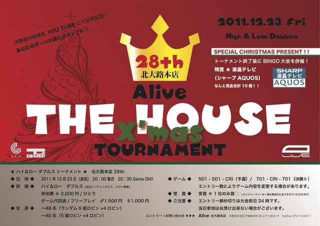 年末最後にX'masと合わせて、超SPECIALなハウスやっちゃいます! なんとトーナメント終了後にBINGO大会! 特賞は「SHARP 液晶テレビ AQUOS」 ビッグなクリスマスプレゼントをゲットしちゃおう☆ 以下詳細です。 開催日時◆ 2011年12月23日(金祝) 20:00集合 20:30 Game ON!! ハイ&ロー ダブルス(当日レーティングにて、ドロー発表) 参加費◆2,000円/ひとり ゲーム代◆別途/フリープレイ ♂1,500円 ♀1,000円 定員◆ 〜48名(ランダム6組ロビン×4ロビン) 〜40名(5組ロビン×4ロビン) ゲーム内容◆ 501 -
