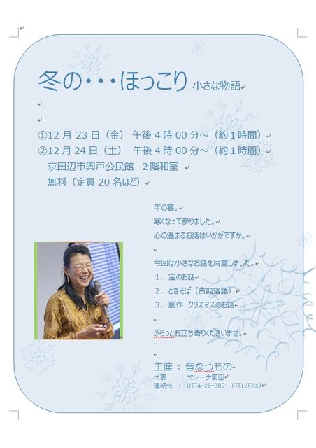 「ことばの家」で集中して学んでいらっしゃる生徒さんのおひとり、 前田さんが年末にお話し会を催します。 小さなお話し会ですが、きっと、 聴き応えのある時間になりますよ! ぜひ、お近くの方、いらしてくださいね。 年の暮。 寒くなって参りました。 心の温まるお話はいかがですか。 今回は小さなお話を用意しました。 1.宝のお話 2.ときそば(古典落語) 3.創作 クリスマスのお話 ぶらっとお立ち寄りくださいませ。 日時: 12月23日(金) 午後4時00分〜(約1時間) 12月24日(土) 午後4