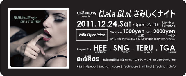 クリスマス•イブに行われる “さみしくナイト!” 毎年何処かでは行われているイベントでしょう♪ 今年もサンドリヨン+ プレゼンツで行われます☆ 今年は先日も翌日もおやすみです☆ モチロンさみしい人がと言う訳ではありませんよっ☆w 「さみしくナイ・ト!」です☆w 皆で楽しく祝うX'masもイイでしょっ♪ クリスマスだからと言って恋人同士の方だけのものでもありません♪ 皆で騒ぐのが好きな方! 取り合えず予定の無い方! 勿論、音が聴きたい方! 現在お相手のいない方! 何となくさみしい方! 大集合