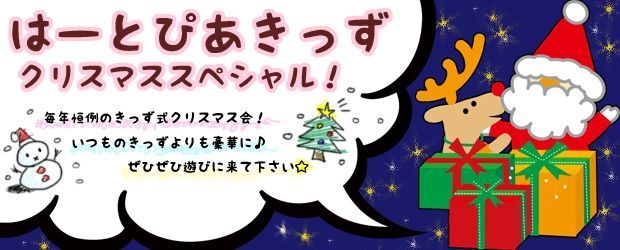 告知失礼いたします。 《はーとぴあきっずクリスマススペシャル》 今年のはーとぴあきっずX,mas SPはクリスマスイブの日です!! 人形劇やバルーンショー、プレゼント交換にゲーム、工作など楽しいイベントてんこ盛り。 クリスマスもハートピアで楽しく過ごしましょう!親子でお越し下さいませv ◆時 2011年12月24日(土) 13:30開場 14:00開演 ◆会場 ハートピア春江 ハートピア(大)ホール ◆チケット 前売:500円 当日:700円 (大人・子供同一料金/乳幼児無料/全席自由/託児室なし) ※乳幼児の方もゲームや工作