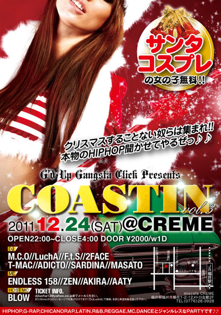 管理人様告知失礼します! COASTIN vol.3 12/24(SAT)@CREME OPEN 22:00 CLOSE 4:00 DOOR 2000yen1D サンタコスプレで来てくれた女の子無料!! 『DJ』 M.C.O LuchA F.t.S 2FACE T-MAC ADICTO SARDINA MASATO 『MC』 ENDLESS158 ZEN AKIRA AATY 『HOSTMC』 BLOW 『HUMANBEATBOX』 SHAKER-104 クリスマスすることない奴らは集まれ!! 本物のHIPHOP聞かせてやるぜっ♪♪