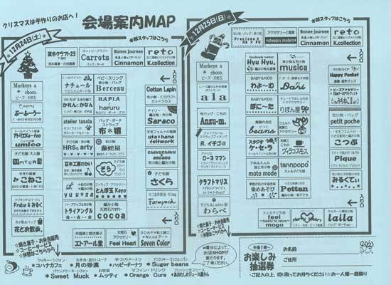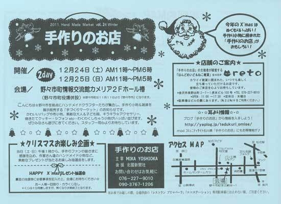 12/24 土 11時〜6時 12/25 日 11時〜5時 野々市町情報交流館カメリア2Fホール椿 プレゼントがあたるお楽しみ抽選会あります。 手作りのお店 076-227-9010 090-3767-1206