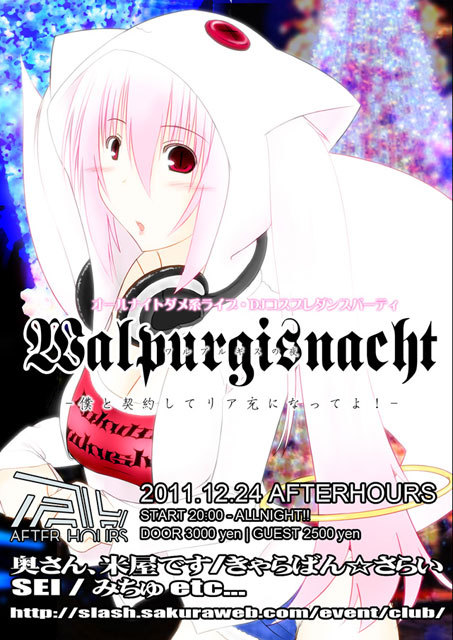 24日にオールナイトダンパイベントを開催致します、SKUNK WORKSです。 この場を借りてイベントの宣伝をさせて頂きます。 ■イベント名 Walpurgisnacht -僕と契約してリア充になってよ!- http://slash.sakuraweb.com/event/club/ ■日時 2011/12/24 20:00-29:00 ■料金 お一人様3000円 予約特典・プレゼント特典500円割引有 ■予約案内 ホームページ上・アフターアワーズさん等で受け付けております。 ご予約は24日0時まで受付とさせていただきます。 ■Walpurgisnachtって? クリスマスの夜に開かれる、一夜