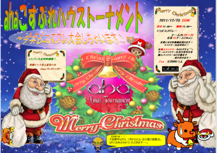 ¥Ï¥¦¥¹¤Î¹ðÃΤǤ¹¡ª Ê¿À®23ǯ12·î25Æü¡ÊÆü¡Ë ¥³¥¹¥×¥ì¥Ï¥¦¥¹¥È¡¼¥Ê¥á¥ó¥È¤ò³«ºÅ¤·¤Þ~¤¹\(^o^)¡¿ ... ¥À¡¼¥Ä¤È¤ÏÊ̤˥³¥¹¥×¥ìÂç²ñ¤âƱ»þ³«ºÅ¤·¤Þ¤¹¤Î¤Ç¡¢³§¤µ¤ó¤É¤ó¤É¤ó¥³¥¹¥×¥ì¤·¤Æ¤¤Æ²¼¤¤¤Í(^o^)¡¿ ¥³¥¹¥×¥ìÂç¾Þ¤ËÁª¤Ð¤ì¤¿Êý¤Ï¤Ê¤ó¤È¡ª¹ë²ÚXmas¥×¥ì¥¼¥ó¥È¤¬¤¢¤ê¤Þ¤¹¤è(^^)v ¤Ç¤Ï¡¢¥Ï¥¦¥¹¤Î¾ÜºÙ¤Ç¤¹¡ª Æü»þ¡§23ǯ12·î25Æü㈰¡¡¼õÉÕ12¡§00¡Á¡¡³«»Ï13¡§00¡Á ¾ì½ê¡§Darts Cafe¡¡aha ¡¡¡¡¡¡Ê¡²¬¸©Ê¡²¬»ÔÃæ±û¶è·Ù¸Ç2ÃúÌÜ18-17¡¡SHOWA¤±¤ä¤Ä̤ê¥Ó¥ë5³¬ ¥²¡¼¥àÆâÍÆ¡¡¥È¥ê¥ª¥¹¥á¥É¥ì¡¼¡¡ ¡¡¡¡¡¡¡¡¡¡¡¡¥Á¡¼¥à¥ì¡¼¥Æ¥£¥ó¥°¤Ï30¡Á35¤Ç