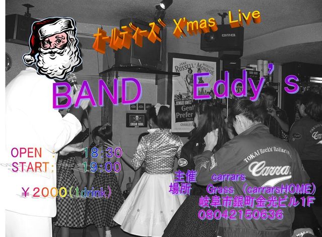 BAND Eddys OPEN 18:30 START 19:00 CHARGE¥2.000(1付き) 岐阜市銀町金光ビル1F 080 4215 0636 主催carrars 【12月25日X’masEddysさんからの素敵なPresent 楽しい予感 carrars主催!今年最後のLive 皆様 ご一緒にdanceしましょう お時間有る方是非遊びに来てねっ】