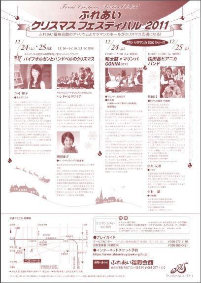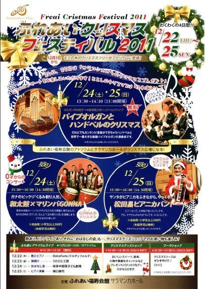 コンサート ふれあいクリスマスフェスティバル2011 サラマンカからのクリスマスプレゼント サンタがピアニカをふきながらやってきた 〜マサさんのピアニカはスゴイぞ! 出演/松田昌ピアニカバンド [松田昌(ピアニカ)中垣友希(ピアノ・ピアニカ)中村新(パーカッション・バスメロディオン)] 会場/サマランカホール(岐阜県岐阜市薮田南5-14-53) http://salamanca.gifu-fureai.jp/ 開場/14:30 開演/15:00 料金/小学生以上:500円 未就学児:無料 ※全席自由 予約・お問い合わせ/県民ふ