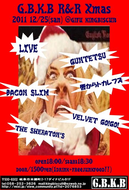 <<<G.B.K.B R&R Xmas>>> 2011 12/25(sun) @gifu kingbiscuit live :GUNTETSU :Velvet Go!Go! http://web.me.com/velvetgogo/ :唇からトカレフズ :BACON SLIM :THE SHERATON'S http://thesheratons295.blogspot.com/ open18:00/start18:30 door\1500(1drink+freejunkfood!!)