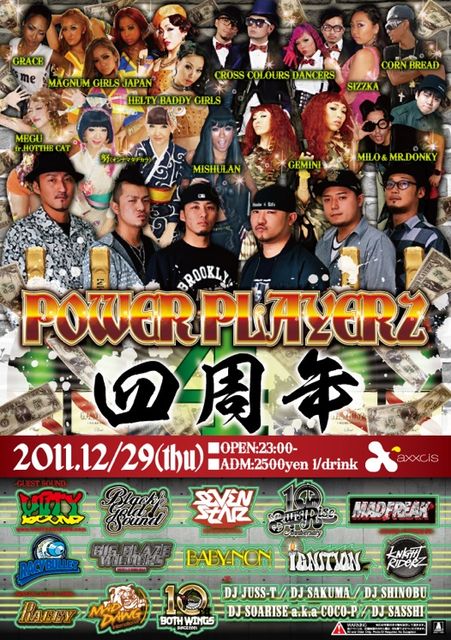 POWER PLAYERZ 4周年年末SP@渋谷axxcis 12/29(木曜日) 18歳から入場可 ついにきました POWER PLAYERZ 4周年 今年は4Fも開放し3フロア行き来自由DJ TY-KOH率いるBIG BLAZE WILDERSやUNITY SOUND等超豪華 1000人規模年末SP大盛況今回も満員御礼間違いなし 2時までドリンク300円 更に、 4FではHIPHOP,RBで今都内HARLEM,axxcis等で大活躍のDJたちが出演です このBIGイベントを特別最安値ゲスト料金で
