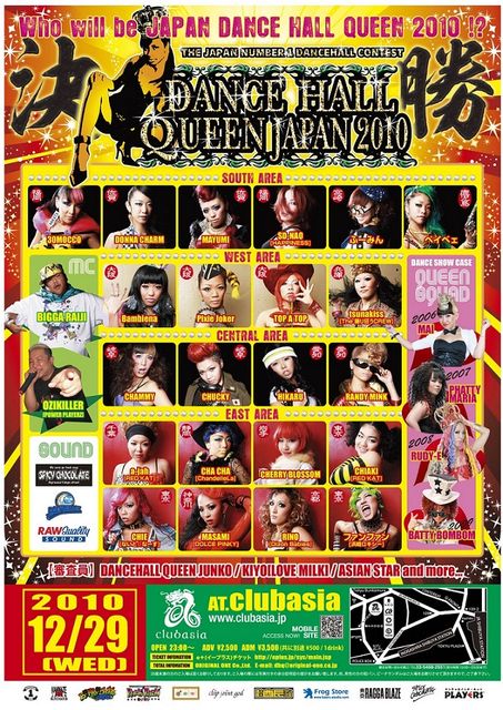 ◆DHQ JAPAN 2010〜決勝〜◆12/29[水] 管理人様、告知失礼致します。 10月・11月に行われた全国予選大会(福岡・大阪・名古屋・東京/計85名)を勝ち抜いた22名のレゲエダンサーの中から日本一のレゲエダンサーを決めるFINAL STAGE。 2006[MAI]/2007[PHATTY MARIA]/2008[RUDY-E]/2009[BATTY BOMBOM]、今までに4人のダンスホールクイーンを生んだDANCEHALL QUEEN JAPAN、今年の世界大会(JAMAICA)ではRUDY-Eが2位&ベストドレッサー賞を獲得、後一歩で世界一のクイーンをつかめる所まで来た! 日本人から世界一のレゲエダンサーを生む為に開
