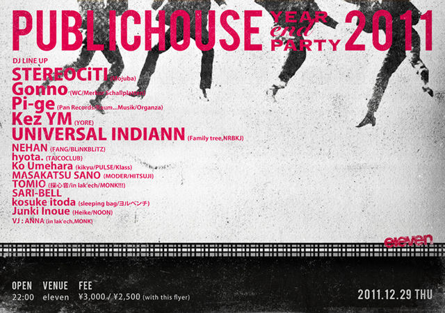 2011.12.29 THU PUBLICHOUSE -YEAR END PARTY 2011- Open: 22:00 ¥3000 ¥2500(with flyer) DJ: STEREOCiTI(Mojuba) Gonno(WC/Merkur Schallplatten) Pi-ge(Pan Records/Raum...Musik/Organza) Kez YM(YORE) UNIVERSAL INDIANN(Family tree,NRBKJ) NEHAN(FANG/BLiNKBLiTZ) hyota.(TAICOCLUB) Ko Umehara(kikyu/PULSE/Klass) Masakatsu Sano(MODER/HITSUJI) TOMIO(探心音/in lak'ech/MONK!!!) SARI-BELL Junki Inoue(Heike/NOON) VJ: ANNA(in lak'ech,MONK) 東京から発信するレトロフューチャー、遊びきれるパーティー