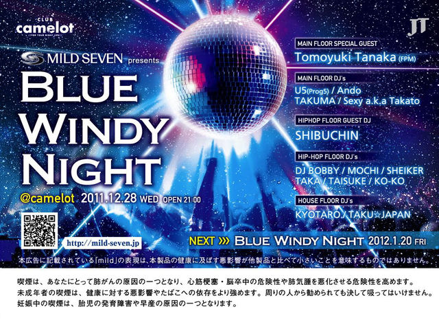 2011-12-28 (水) BLUE WINDY NIGHT MILD SEVENがお届けする豪華アーティストによるレギュラー・パーティ 都内で活躍中のDJ達が大集結 GUEST DJにTomoyuki Tanaka (FPM)が登場 3フロア開催の1000人超えPARTYです ディスカウント MEN¥2000/2d WOMEN¥1000/2dでおとりします ディスカウント希望の方は 早急に入りたい場合は五十嵐ゲストのイヤラシと言っても対応可能です!! 必ず