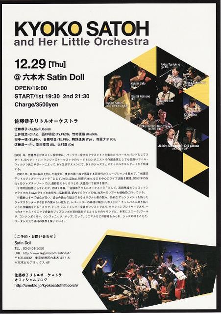 日時:12/29(木) 開場18:00 1st:19:30 2nd:21:30 場所:六本木 サテンドール http://www.leglant.com/satindoll/ 東京都港区六本木4-11-5 六本木ビルアネックス 4F TEL:03-3401-3080 料金:¥3,500 メンバ:土井徳浩(cl,as) 西口明宏(ts,cl,fl) 竹村直哉(bs,bcl) 谷殿明良(tp,flh) 田中一徳(tp,flh) 駒野逸美(tb) 寺屋ナオ(g) 佐藤浩一(p) 安田幸司(b) 大村 亘(ds) 佐藤恭子(leader,conduct,ss,as,fl) 今年最後の演奏は、初出演になる六本木サテンドールにて行われます。 2set構成で各1時間15分のステージにな