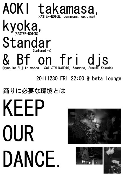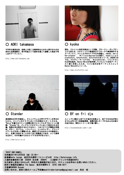 「KEEP OUR DANCE」 踊りに必要な環境とは 出演 AOKI takamasa(RASTER-NOTON, commmons, op.disc) kyoka(RASTER-NOTON, onpa)))))) Standar(telemetry, audio.nl) Bf on fri djs(Kyosuke Fujita morec., Sai STHLMAUDIO, Asamoto, Susumu Kakuda) 日時 2011年12月30日(金)22:00〜 会場 beta lounge 金沢市木倉町1-1エコービルB1 http://betalounge.info 入場料金 前売り券 2500円 当日券 3000円 (入場時1ドリンク代別途500円) ※大変申し訳ありませんが、80名の入場制限があります。チケットはお早めに