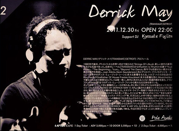 OPEN 22:00〜 SPECIAL GUEST Derrick May SUPPORT DJ Kyosuke Fujita TICKET 1 DAY ADV 3000yen/W1D 1DAY DOOR 3500yen/W1D 2DAYS TICKET 4000yen/W1D