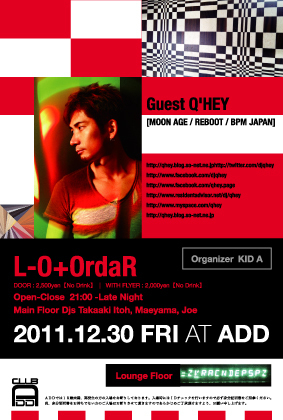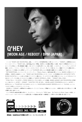 管理人様、告知失礼いたします。 GUEST DJ:Q'HEY(MOON AGE/REBOOT/BPM JAPAN) DJ:TAKAAKI ITOH(WARSAW(caico music) MAEYAMA JOE LOUNGE DJ:Naofumi Organizer:KID A OPEN 21:00 ADDモバイル会員 2,000YEN DOOR 2,500YEN ---------- Q'HEY [MOON AGE / REBOOT / BPM JAPAN] レーベル「MOON AGE RECORDINGS」主宰。ハードテクノの代名詞的存在とも言えるパーティー「REBOOT」を西麻布elevenにて、レーベルパーティー「MOON AGE」を新木場ageHaにて開催。1989年よりDJ活動を開始して以降、今日までの間東京のテクノシーン