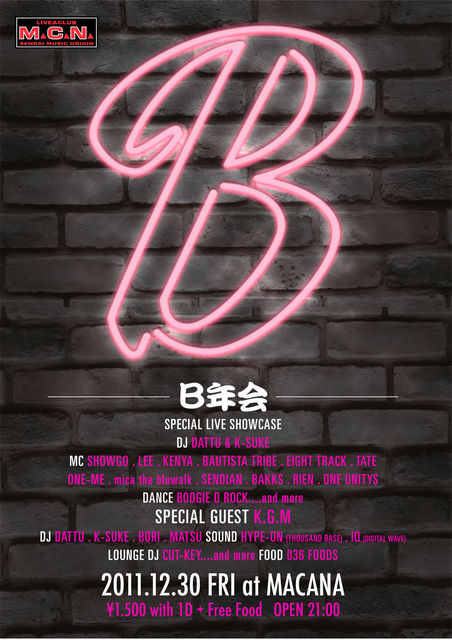 管理人様告知失礼致します。 30日は新しくなったマカナで盛り上がりましょう!! \1.500で1DとFREE FOOD付ですよ!! 『 B 年会 』 @CLUB MACANA 2011.12.30(FRI) OPEN 21:00〜GOOD MORNING! \1.500(1D+FREE FOOD) ☆SPECIAL LIVE SHOWCASE☆ DJ :DATTU & K-SUKE MC'S : SHOWGO / LEE / KENYA / BAUTISTA TRIBE / TATE / ONE-ME / mica the bluwalk / SENDIAN. / BAKKS. RIEN ./ ONEUNITYS / SKILLS.…etc DANCER:BOOGIE D ROCK.…etc ☆SPECIAL GUEST☆ K.G.M ☆DJ☆ DATTU K-SUKE BORI MATSU