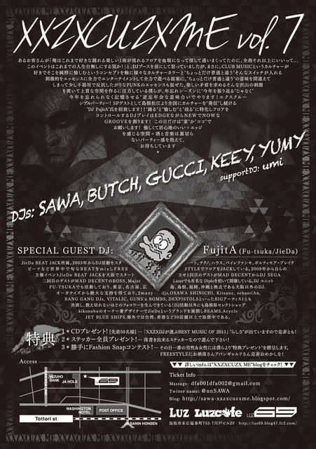XXZXCUZX ME vol.7 [ELECTRO] ■2011.12.30(FRI) ■22:00start ■@LUZ69 ■adv予約 or wiz flyer/\1500(1D) ■door/\2000(1D) *先着50名様にコンピCD present! *ご来場のみなさま全員にステッカーpresent! 【GUEST DJ】 FujitA(Fu-tsuka,JieDa) http://blog.kikunobu.jp/ 【DJs】 SAWA butch GUCCI KEEY yumy umi(←Support DJ new in!) *前回の10月1st.Anniversary、お越し下さったお客様に再度感謝を伝えたい! *せっかくお越し下さったのに、お話出来てない;; *これから繋がっていく新しい