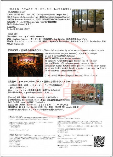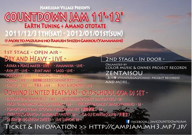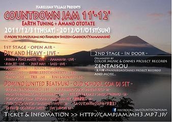 COUNT DOWN JAM11'-12' "EarthTuning∞天音立” COUNTDOWN.NEWYEARS PARTY2011-2012... kawaguchiko.yamanashi.Japan 〜TheEarthTuning-Amanoototate〜 開催日:2011.12.31大晦日〜 2012.1.1元旦 開催地:山梨県河口湖[森と湖の楽園/自然樂校](共催) GATEOPEN>13:00 START:12.31大晦日>15:00 CLOSE:1.1新年>15:00予定[野外・雨天・雪天決行(屋内劇場あり)] [開催支援費:TICKET] 早割り:5500円(開催事務局限定販売11/25まで) 前売り:6000円(11/25より〜12/20まで各ガイドにて販売) 当日:7000円 (