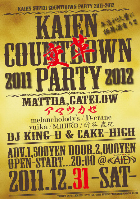告知失礼致します。 毎回とんでも無い盛り上がりを魅せるKAIENカウントダウン!!! 今年もバカスカバカスカ盛り上がって〜 さくっと2011年から2012年を迎えましょうよ^^ KAIEN企画スーパーカウントダウンパーティ! BAND,DJ,MC,DANCE,SINGER,弾き語り… 音楽イベントの全ての要素を取り込んだスーパーな内容! そして今年は新年早々スーパー大抽選会を行います! 良い歳こいてお年玉もらう大チャンス! もちろん大量に振舞酒も用意! リニューアルしたKAIENで今年もカウントダウンしましょうよ! KAIEN presents... KA