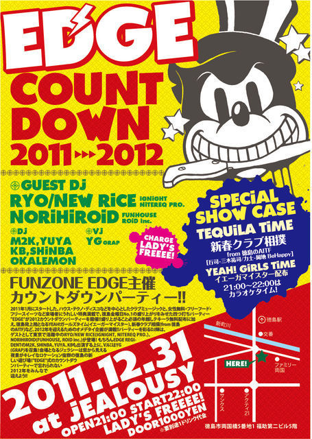 管理人様貴重なスペース失礼いたします 年末カウントダウンパーティーのお知らせです ----------------------------------------- FUNZONEの超人気パーティー”EDGE”がカウントダウンパーティーとして復活! ”EDGE”おきまりの女性入場無料とフリースイーツは健在のまま、東京からのスペシャルゲストと、多数のアトラクションなど満載で大幅バージョンアップ完了!来る2012年をめでたく迎えます! 場所は窓からの美しい夜景も楽しいジェラシーにて開催! ----------------------- CM EDGE PRESENTS _/_